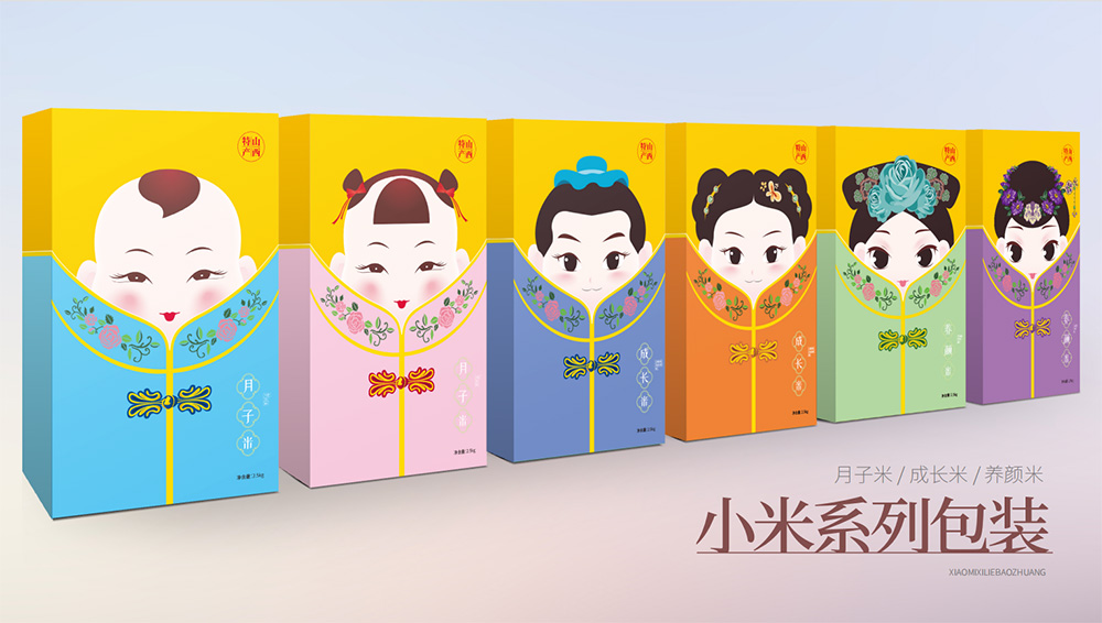 區(qū)別于傳統(tǒng)小米包裝,根據(jù)小米的不同搭配將小米分為月子米,成長米,養(yǎng)顏米3類,視覺上分別以成對的嬰兒、小孩、年輕女性/媽媽為主要形象元素,采用現(xiàn)代插畫的形式創(chuàng)造三組萌趣生動(dòng)的形象,畫面生動(dòng)富有張力,配色清醒典雅,增強(qiáng)產(chǎn)品親和力。包裝盒外加設(shè)計(jì)有古典服飾圖形的封套,整體形式新穎富有層次感,拆掉封套將呈現(xiàn)另一幅畫面,開盒有趣味,讓整體形成記憶點(diǎn)。